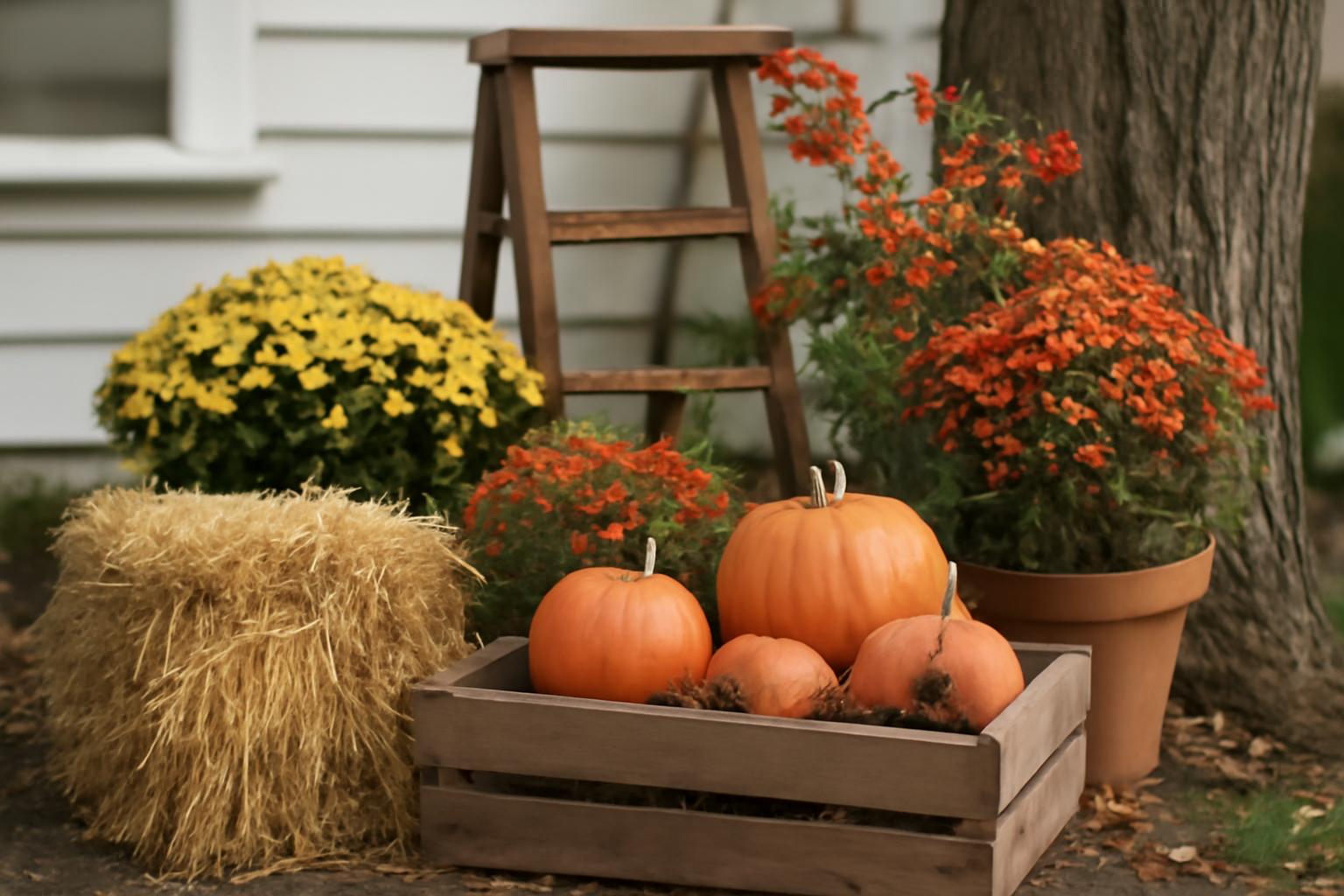Aby dopełnić naturalny charakter, sięgnij po elementy kojarzące się z sielską jesienią. Snopki słomy lub siany (prawdziwe lub stylizowane) postaw przy wejściu lub oprzyj o pień drzewa. Stary drewniany drabiniak lub skrzynia po owocach wypełniona dyniami i szyszkami stworzy klimatyczny zakątek. Gałęzie z owocami jarzębina wetknięte między rośliny w donicach dodadzą intensywnego koloru.